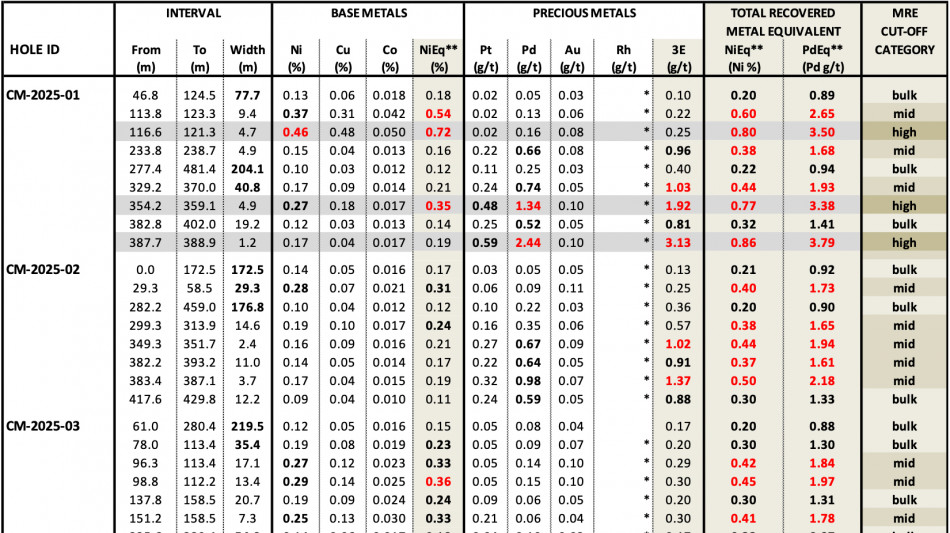"These results confirm the extension of sulphide-rich polymetallic mineralization beyond the current Chrome Mountain and HGR resource boundaries," said Michael Rowley, President and CEO. "The consistent platinum and palladium enrichment within the broader nickel-copper sulphide system continues to demonstrate the strength of the project's multi-metal profile as we advance toward an updated Mineral Resource Estimate in the first half of 2026. Assays for rhodium remain pending and will be reported as received."