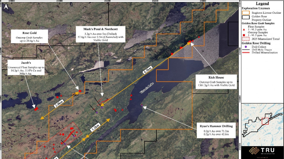 TRU CEO Steve Nicol commented: "TRU is diligently advancing with its stated aim of efficiently discovering the full gold and copper potential at its Golden Rose Project. In the 2025 mapping and ground truthing program, a previously unknown mineralized trend of already impressive dimensions has been delineated centered upon the mineralized sandstone unit discovered during the 2025 drill program(1), with final dimensions of the trend yet to be determined. Trenching and subsequent drilling is now in planning for this area. The 2025 field work also elevated the prospectivity of the previously recognised Falls Zone and the Jacobs to Rose Gold corridor adding significantly to the previously limited understanding of these prospective targets. Furthermore, the 2025 field work identified other quality targets across the project area warranting further examination as knowledge grows regarding the controls on mineralization at Golden Rose. I want to personally thank the TRU team for its tireless efforts during an arduous 3 month "on foot" field work program achieving near total coverage over much of the large project area resulting in an invaluable database of surface information. This information has dramatically advanced the knowledge and understanding of the distribution of mineralization across much of the project area which is important in focussing and accelerating work streams into the future."