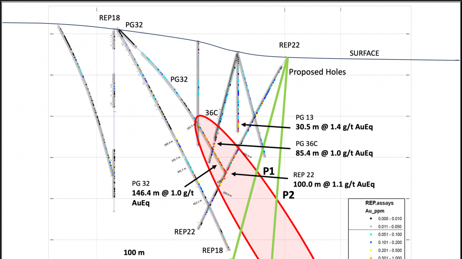 "The program which included two opposing holes REP18 and REP22 was successful in defining the orientation of the mineralized zone and the potential for additional higher-grade at depth that may also extend closer to surface", stated Ron Little, CEO for Wolfden. "The intercept in REP22 strongly suggests that the mineralized zone dips steeply to the east, beyond the end of hole PG32. Given the size of the system and the grades intersected in hole REP22 (40.9 m at 1.92 g/t AuEq), our focus is as much to find more of the same down dip as it is to test the potential extent and size of the higher-grade as well (3.4 m at 11.9 g/t AuEq). As a result, drilling is expected to recommence in July to test for the continuation of the zone down dip to the east (see Figure 3 proposed holes P1 and P2)".