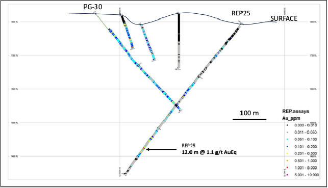 The Company's third drill hole in the program, REP25, was a 300-meter step-out hole drilled to a depth of 572 metres beneath Target Hill (Target #4 on Figure 2). The hole is situated near the NE end of a 1.7km long structural corridor characterized by the presence of altered rhyolite. Target Hill is a highly altered rhyolite dome from which historical drill hole PG30 returned a 315.5 metre zone of alteration and mineralization grading 0.1 g/t AuEq (Figure 6). Hole REP25 intersected at depth a higher grade interval of 12.0 metres at 1.11 g/t AuEq in similar-looking, intensely altered flow-banded rhyolite containing fine-grained sulphides, like those seen in REP18 and 22. Results include an intercept of 12.0 m at 1.1 g/t AuEq which is higher grade than the historical hole PG30 and will be a useful indicator in the next drill target long trend.