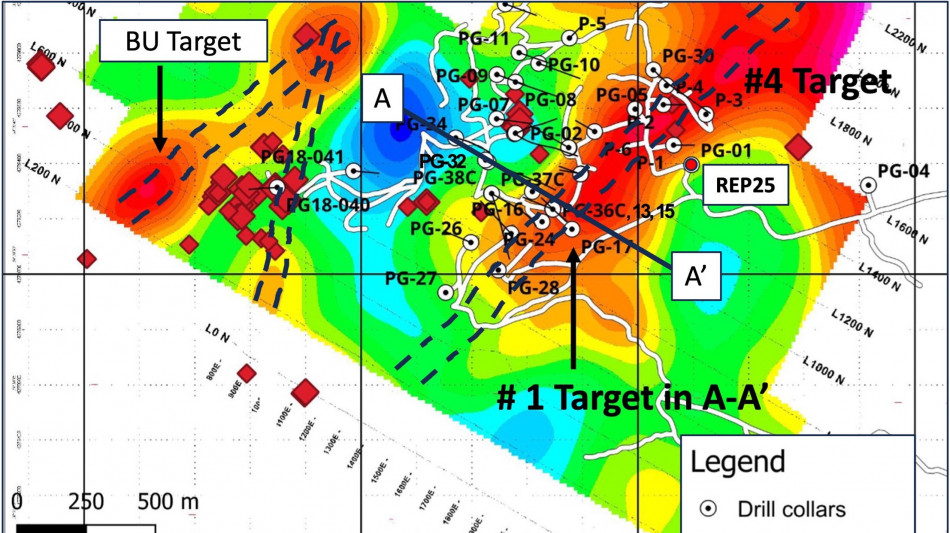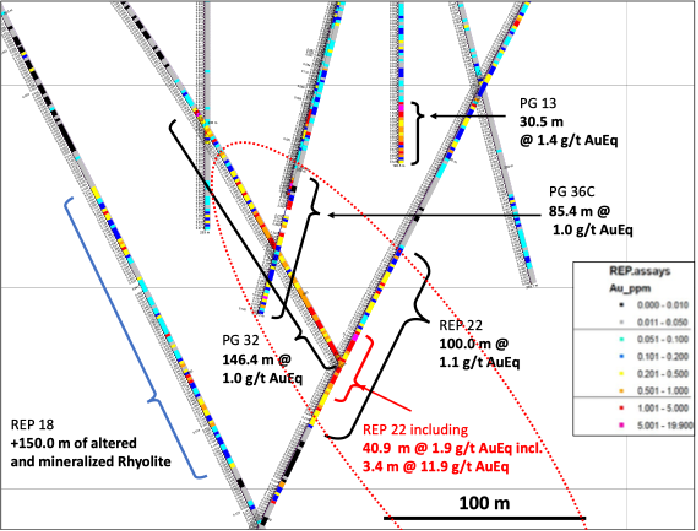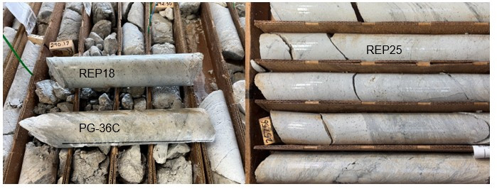 Hole REP18, intersected mineralization below and parallel to that intersected in hole PG32, but with a lower tenor than REP22 and hole PG32. This is not unexpected given the distance between holes and the apparent near-parallel orientation of the mineralized zone relative to that of the drill hole. Visually, both holes (REP18 and 22) host the same altered flow-banded rhyolite with similar intensities of alteration and abundances of fine-grained sulphide observed in the historical holes (see photos of PG36C and PG32 in Figure 5). Some additional study work is underway, including the interpretation of the hyperspectral data of the drill core in order to determine any mineral alteration assemblages that may associated with the higher-grade portions of the gold zones that could assist in the targeting of future drill holes and the overall understanding of the mineralized system.