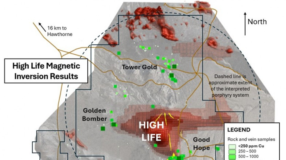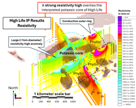 Results from recent magnetic and Induced Polarization (IP) surveys completed on the Property reveal a concentric geophysical footprint consistent with a gold-copper porphyry system at the High Life target.