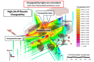 The surveys outline a large (approximately one kilometer in diameter), single positive magnetic anomaly (See Figure 1). Three-dimensional processing reveals a robust, deeply rooted magnetic body, interpreted as the potassic core of a porphyry system (Figure 2).