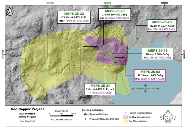 TORONTO, ON / ACCESS Newswire / March 16, 2026 / Sterling Metals Corp. (TSXV:SAG)(OTCQB:SAGGF) ("Sterling" or the "Company") is pleased to report the remaining assay results from its expanded and completed 2025 drilling program at the Soo Copper Project ("Soo Copper" or the "Project") located near Batchewana Bay, Ontario. Results from five additional drill holes continued to expand the copper mineralized footprint, while further defining and extending the high-grade bornite zone discovered in September 2025, revealing a new bornite-covellite zone to the northwest (Figures 1 and 2).