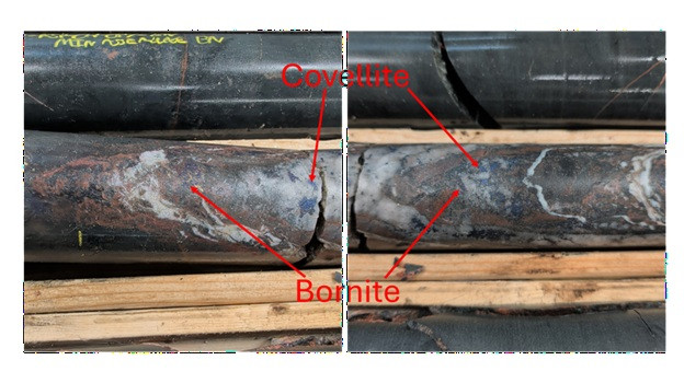 Hole MEPS-25-22 intersected the high-grade zone approximately 60m above and northwest of MEPS-25-21, confirming vertical continuity of the high-grade mineralization (see Table 1). Covellite mineralization was again encountered toward the bottom of the hole, further supporting the interpretation of a strengthening copper system with depth.
