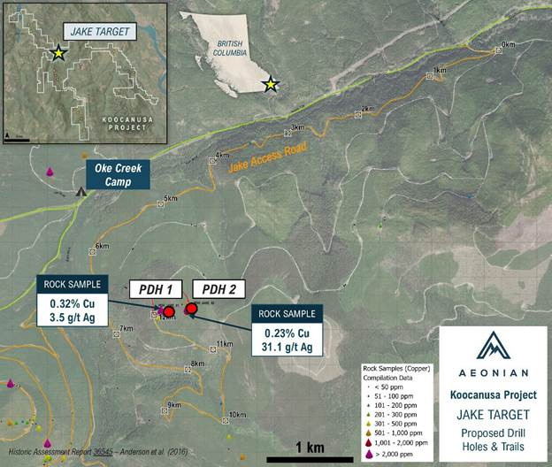 "Commencing our inaugural drill program at Koocanusa is an important milestone for Aeonian. The Jake target presents a compelling combination of encouraging copper-silver values at surface, favourable sedimentary host rocks, and a strong conductive geophysical signature that may represent sulphide-bearing horizons at depth.