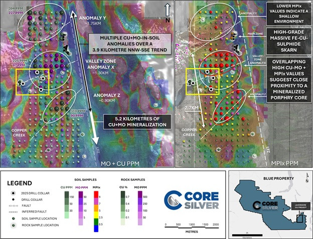 "Results from our 2025 drilling campaign continue to demonstrate the scale and fertility of the Laverdiere Porphyry System," said Nick Rodway, CEO of Core Silver Corp. "The presence of widespread copper-molybdenum mineralization and high-grade porphyry veins across multiple holes confirms that we are exploring a large and robust porphyry system. With mineralization now defined over more than five kilometres of strike and remaining open at depth and along trend, we believe Laverdiere has the potential to develop into a significant new copper discovery within an underexplored ore-deposit gap in northwestern British Columbia."