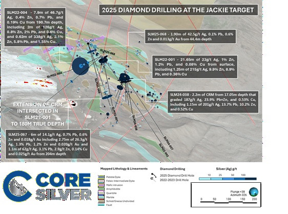 "The 2025 drilling at Jackie confirms that silver mineralization extends below surface and across multiple structural trends," said Nick Rodway, CEO of Core Silver Corp. "These results expand the potential footprint of the system and reinforce Silver Lime as an important component of the broader Blue Property mineral district."