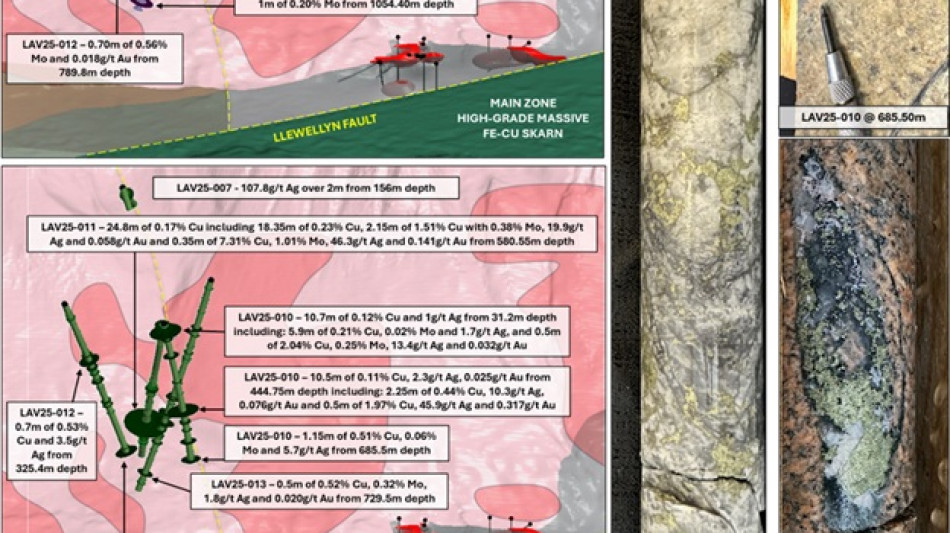 In 2025, hole LAV25-010 was drilled northeast across the Valley Fault and intersected widespread, anomalous zones of molybdenum and copper with more localized, moderate-to-high-grade porphyry copper ± gold veins, including: