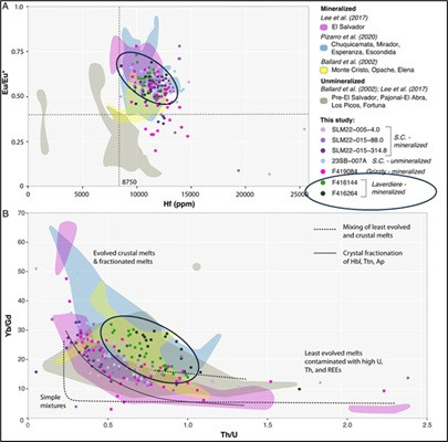 The Laverdiere System shares numerous characteristics with some of the largest and most profitable porphyry deposits globally (e.g. Chuquicamata, Escondida, Bingham Canyon). Geochemically, the Laverdiere porphyry falls within the 'Chuqui Fertility Window' indicating that the system is highly prospective for porphyry copper-gold mineralization with additional evidence supporting magma recharge - an important event that sustains long-lived mineralizing systems by introducing additional copper, gold and sulfur and increasing overall metal endowment of the system (Figure 4).