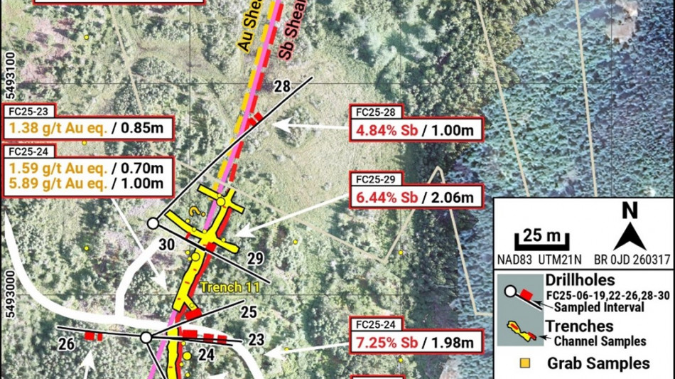 These results are the last, save for a few over-limit assays, from Churchill's Fall 2025 exploration program at the Black Raven Project, which was the first modern exploration of the Frost Cove Mine structure for antimony, and high-grade polymetallic mineralization at the other known prospects throughout the Property. This maiden program consisted of 50 diamond drillholes, with a cumulative depth of 5,176m, along with extensive channel and 2200 soil samples. Thirty holes, totalling 2,743m depth, were drilled at Frost Cove with the remaining holes completed on adjoining targets at Stewart, Taylor's Room, and the "wildcat" program at Pomley Cove Pond. This news release provides results for 14 Frost Cove drillholes along the southern 400m of the mineralized structure, as well as six channel samples and twelve drill holes at Taylor's Room Prospect, and six drill holes which evaluated the historic Stewart Gold Mine prospect; these latter six holes only encountered a single narrow mineralized quartz vein thus no further exploration is planned at Stewart.