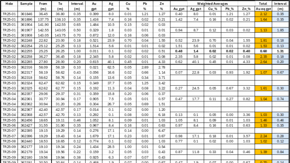 Table 1 - Frost Cove Drillhole Sample Summary Results to 03-12-2025