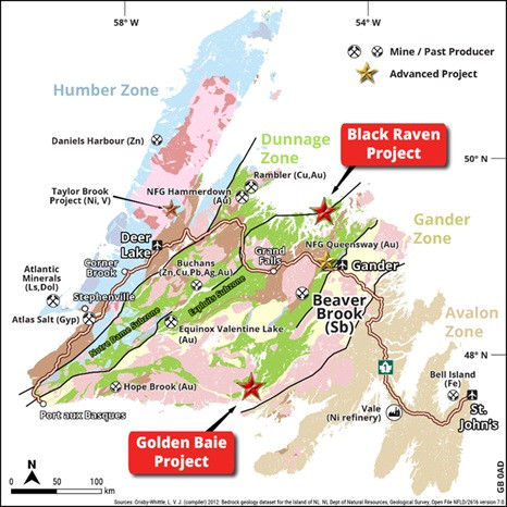 The Golden Baie project is composed of 29 map-staked licences constituting 1,597 claims that in total cover 39,925 hectares or 399.25 square kilometres. The property has good access through its western and central portions with provincial highways 360 and 361 crossing the claim blocks, conveniently within a kilometre of the Swanger's Cove and Le Pouvoir high-grade antimony prospects. The area is serviced by the communities of St. Albans, Milltown and Conne River.