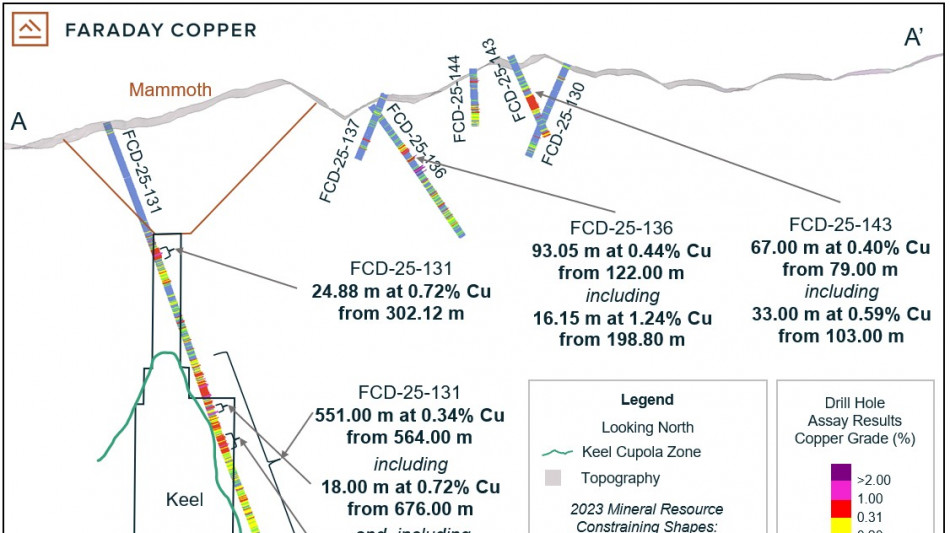 Expanded the Keel mineralization to the northeast, where drilling intersected 551.00 m at 0.34% copper from 564.00 m, including higher grade intercepts of 18.00 m at 0.72% copper from 676.00 m and 34.00 m at 0.56% copper from 749.00 m in drill hole FCD-25-131.