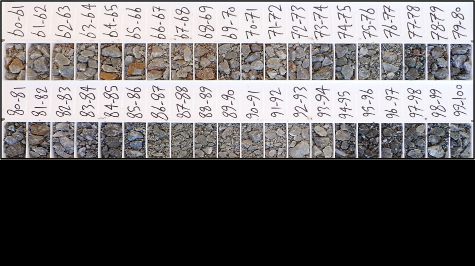 The Intersected mineralisation is typically quite cryptic from the Fin Vein, and is identifiable by the presence of generally minor but varying amounts of sugary vein quartz and typical green copper oxide mineral staining in the oxide zone, and an abundance of copper and zinc sulphide minerals (chalcopyrite and sphalerite), as well as minor galena in the fresh zone (see Figures 4 and 5).