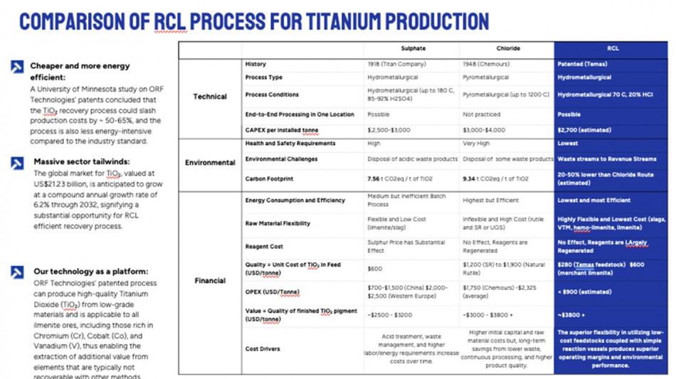 Environmental Performance: The closed-loop design and high reagent recycling rates are core to the RCL platform, irrespective of the target mineral. Over 69% lower operating costs compared to conventional processing due to its core features operating at near ambient temperatures.[3] This means the reduced environmental footprint and enhanced ESG profile are benefits that extend to ores and minerals previously noted, not just TiO2.