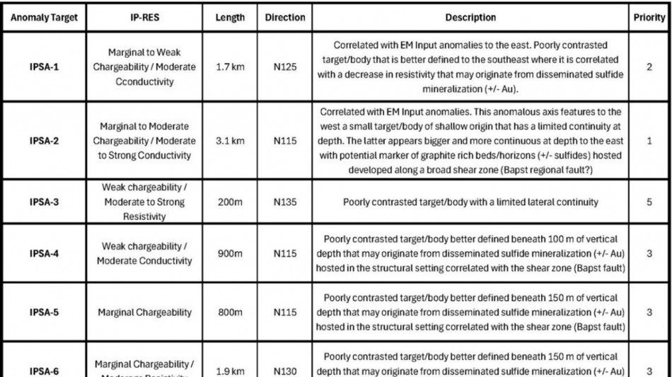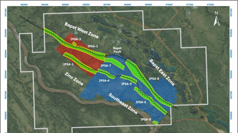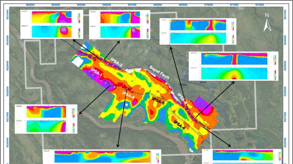 Primary targets for advanced exploration (IPSA-2, IPSA-8) are high-priority, structurally controlled anomalies, directly associated with the Bapst fault. Secondary targets (IPSA-1, 4, 5, 6) are located in the zinc zone and southeastern area, representing subordinate, lower-contrast induced polarization (IP) anomalies requiring follow-up. (Fig. 2).
