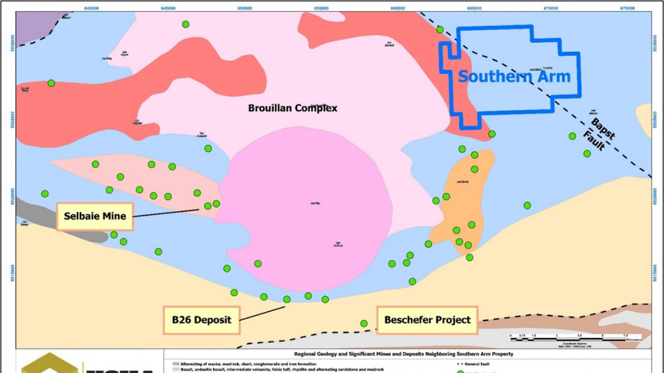 The Southern Arm property consists of 76 contiguous mining claims covering 4218 hectares, located in the prolific Abitibi greenstone belt. This property contains many geologic features consistent with VMS mineralizing systems. It hosts an approximately 7.3-kilometre conductive copper-gold trend along the regional-scale Bapst fault. The bedrock geology of the Property is dominated by the volcanic rocks of the Brouillan-Fenelon group, which hosts the nearby Selbaie mine (~17 km SW), which produced 56.5 million tonnes (Mt) at 0.9% copper (Cu), 1.9% zinc (Zn), 0.6 g/t gold (Au), 38 g/t silver (Ag)1 and Abitibi's B26 deposit (~16 km SW) which hosts an indicated resource of Indicated 13.0 Mt at 2.1% CuEq and 12.3 Mt Inferred at 2.2% CuEq2.