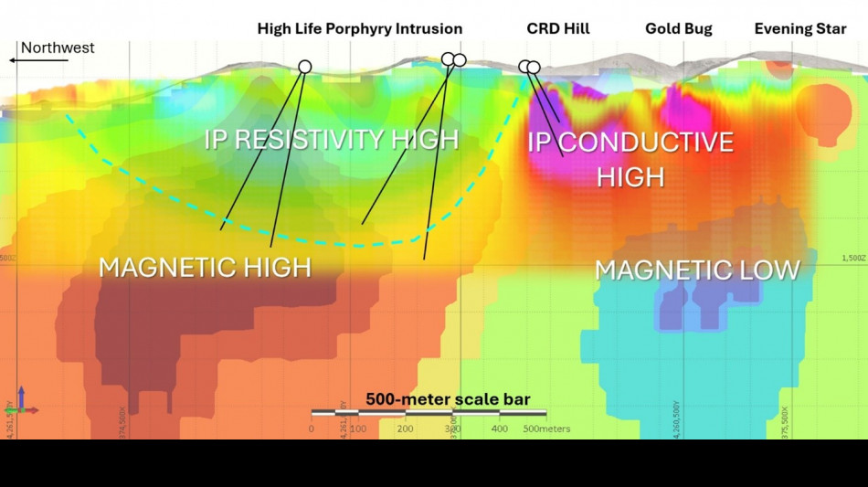 At High Life, 3D geophysical magnetic inversion highlights an anomaly that is one-kilometer across, and combined with IP survey results, outlines a potential intrusive porphyry stock that is positioned just below the surface (see News Release dated 15 January 2025).