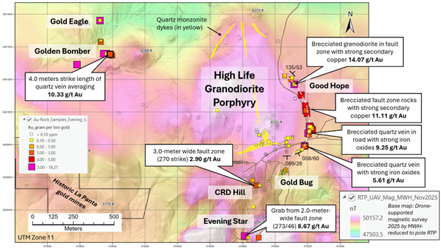 Figure 4. Gold assay results from the recent field program at the Evening Star Property. Base map is Reduced to Pole (RTP) magnetic survey results, which highlights a 1-kilometer diameter magnetic granodiorite porphyry stock at High Life.