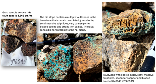 Finding bedding-parallel fault zones with semi-massive sulphides and coarse pyrite crystals in the strongly altered limestone suggests these are the tips of the mantos for a CRD system. Gold assay results from recent fieldwork on CRD Hill include 1.87 g/t Au for a chip sample across a 3.0-meter wide fault zone on CRD Hill (see Figure 3),with copper, lead and silver values pending.This high gold value is significant and indicates a significant gold credit for the potential CRD system, which is typically Cu-Ag-Pb-Zn.
