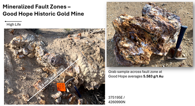 The 2-3m wide Good Hope fault zone, immediately East of High Life, was sampled along 500 meter strike length with strong gold assay results, such as a chip sample across 1.8 m for 5.58 g/t Au, quartz veins assaying 5.61, 5.06, 5.02, and 9.25 g/t Au, and brecciated granodiorite with secondary copper returning 11.11 and 14.07 g/t Au.