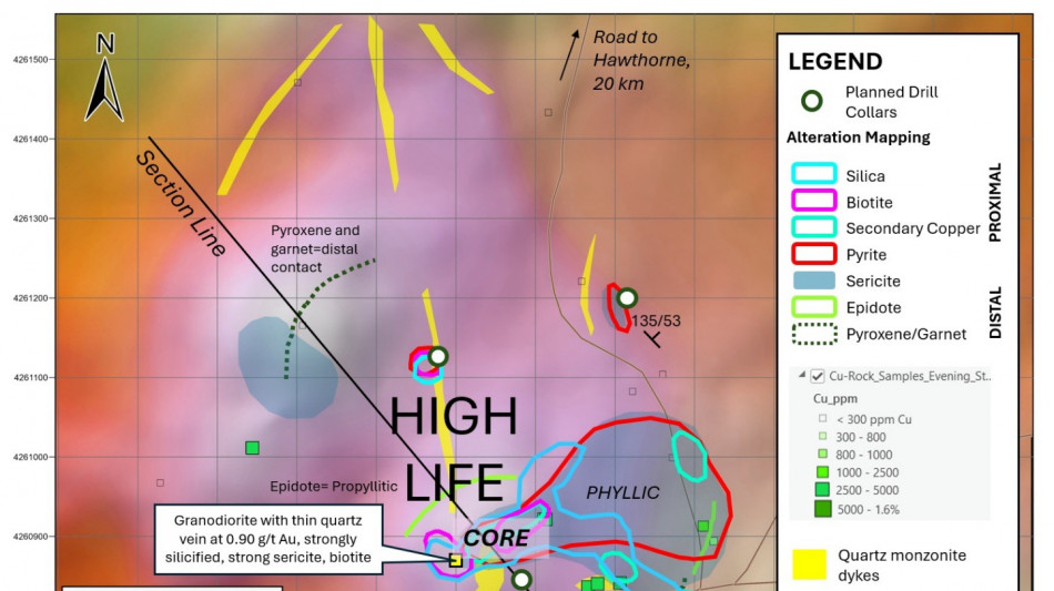 Recent fieldwork at the High Life target has identified strong alteration and gold mineralization consistent with a copper-gold porphyry system (see News Release dated March 31st, 2026), including silicification, sericite alteration, quartz veining, and localized copper mineralization. See Figure 1. These features are spatially associated with geophysical anomalies, including strong magnetic highs with coincident resistivity highs, supporting the interpretation of a robust porphyry system at depth.