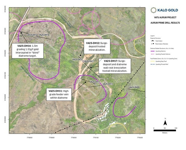 Terry Tucker, P.Geo., President and Chief Executive Officer of Kalo Gold, commented: "What VA26-DH17 demonstrates is a continuous gold system from surface through to the diatreme, rather than isolated intervals. We have now confirmed gold across multiple diatreme centres and validated a blind geophysical target on first pass. Importantly, the interpreted epithermal feeder zone at depth remains an untested target. LiDAR and orthophotography of the project area are complete. Airborne magnetics and radiometrics are scheduled to commence in April following the import of a helicopter from New Zealand; these data will form a key component of follow-up drill targeting."