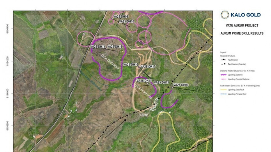 VANCOUVER, BC / ACCESS Newswire / April 8, 2026 / Kalo Gold Corp. (TSXV:KALO)(OTCID:KLGDF)(FSE:9M51) ("Kalo" or the "Company") reports drill results from VA26-DH17 at the QC1 target within the Qiriyaga Complex, confirming a vertically continuous gold system from surface through to the diatreme. The hole intersected 16.90 m at 3.25 g/t Au within a continuous mineralized profile spanning surge deposits, diatreme-margin breccias, and internal veining. Importantly, the interpreted primary epithermal feeder zone at approximately 395 metres depth - defined by the convergence of the Namalau, Loma, and Buca Faults - remains untested and represents a high-priority drill target.