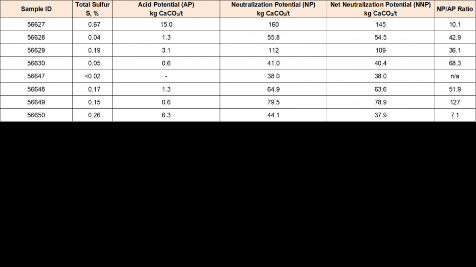 Geochemical characterization is a standard environmental study for metals mining projects. This testwork determines whether any of the different types of rock to be produced by the project have the potential to be reactive (acid-generating leading to metals release) over the long term. Previous limited testwork on a small number of New Amalga wallrock samples conducted in 2020-2021 showed favourable results, demonstrating significant net-acid-neutralizing ratios with all samples tested (Table 1).